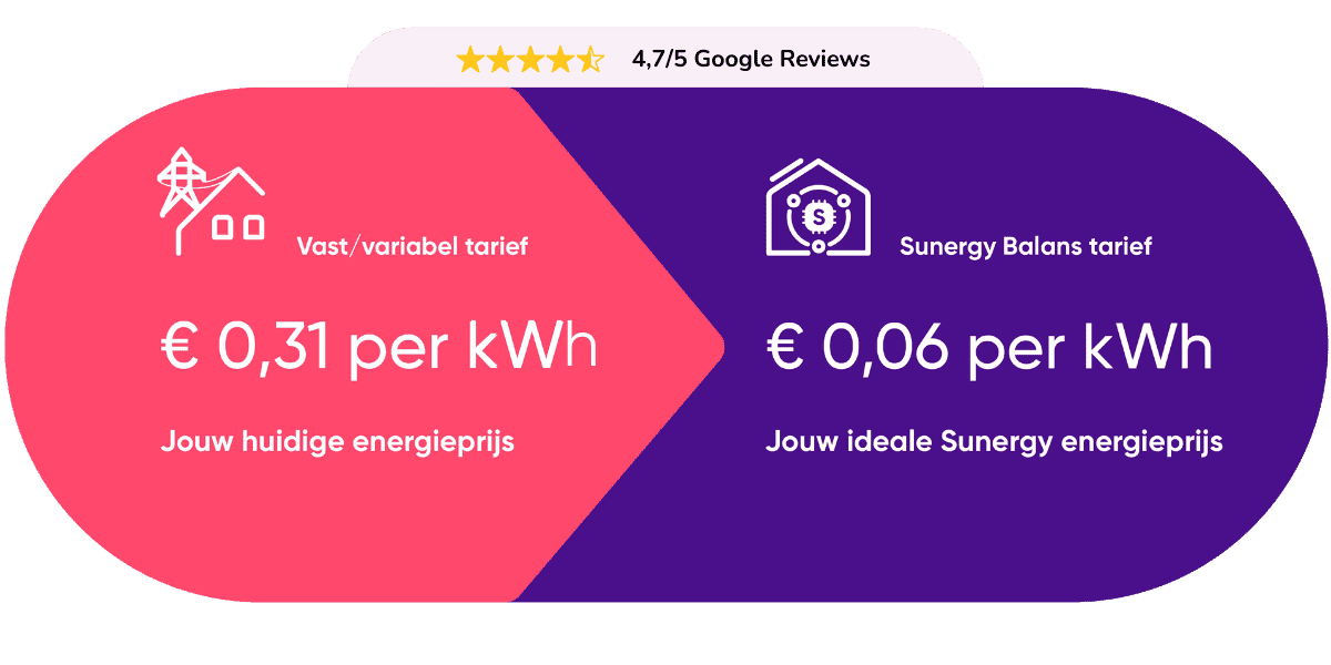 Nog niet klaar voor een ThuisBatterij, maar wil je wel direct voordeel pakken? Stap over op een Dynamisch Energiecontract van Sunergy en bespaar gemiddeld 17% op je variabele of vaste contract. Sunergy staat vervolgens klaar om je in de toekomst te helpen aan een ThuisBatterij en SlimmeRik.